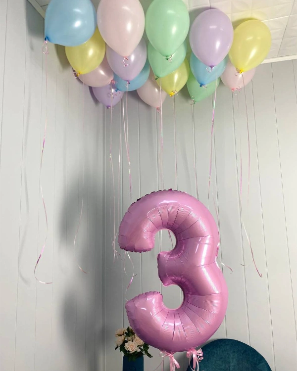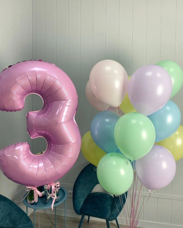 382. Группа фигурных шаров сиреневого цвета. Шары могут иметь форму – цифры, буквы, сердца и другие.