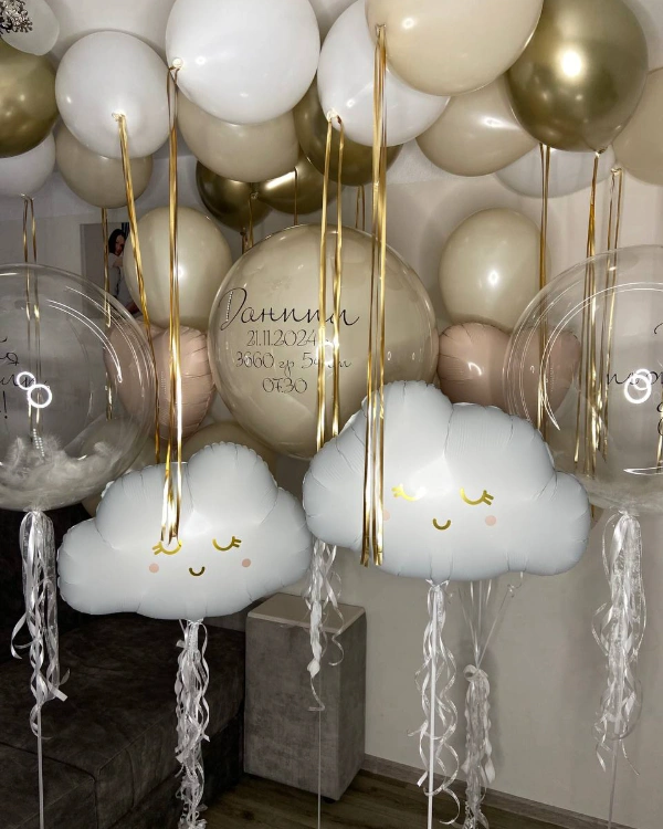 89. Для выписки из роддома. Воздушный шар с перьями можно взять с собой для встречи малыша и молодой мамочки из роддома. Но куда актуальней будет использовать нежный воздушный предмет для оформления детской комнаты. Нежная модель шара подчеркнет трепетность данного события.